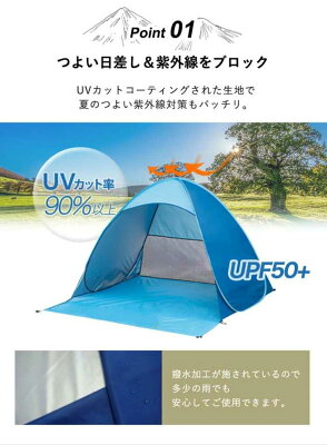 あらゆるレジャーシーンで大活躍 [特徴] (1)つよい日差し&紫外線をブロック UVカットコーティングされた生地で夏のつよい紫外線対策もバッチリ (2)風通しの良い空間 背面には高密度ネットを使用し、通気性の良いテント内に。