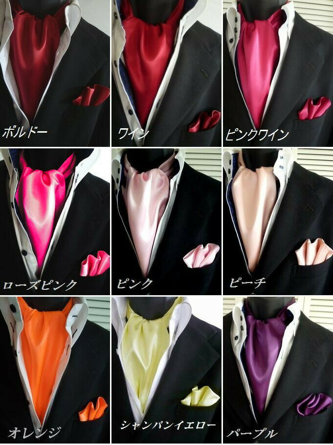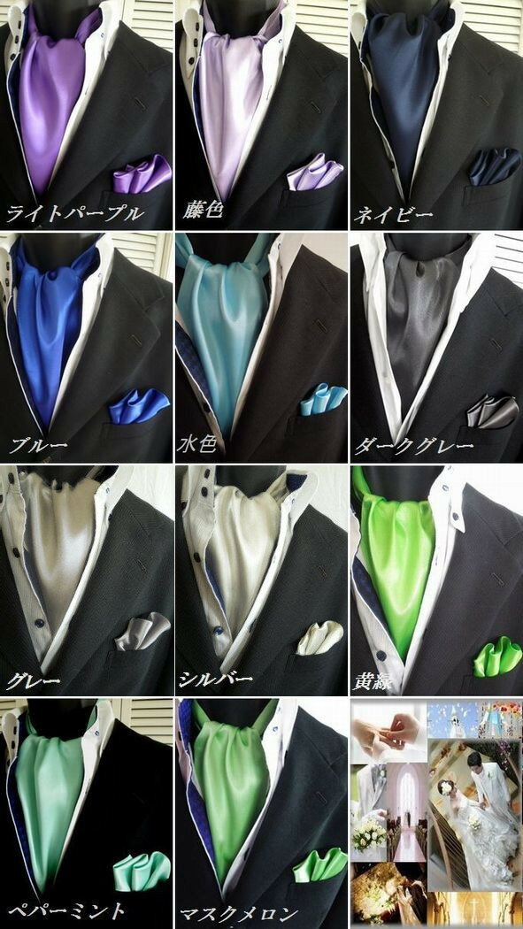 結婚式、パーティーにフォーマルに決まる!!同色のポケットチーフとセットで悩む事なし!!アスコットタイ、ポケットチーフの2点セット♪