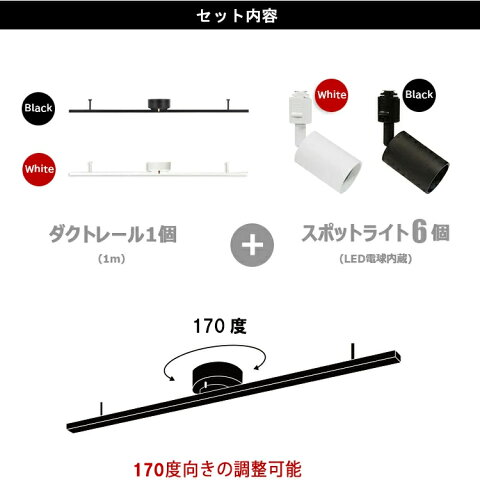 【セット内容】 ■ライティングレールx1本(1メートルタイプ) ■スポットライトx6個 ■LED電球x6個 商品特徴 ※簡易取付式引っ掛けプラグ、ローゼット等の天井器具に簡単に取付けられるライテイングレール。