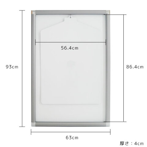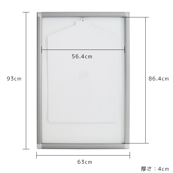 【商品仕様】 外寸:幅63cm×高さ93cm、厚み3.7cm 内寸:幅56.4cm×高さ86.4cm、厚み1.7cm ハンガーサイズ:70.5cm×48cm フレーム素材:ASB樹脂 全面パネル素材:アクリル樹脂(UVカット) 背面板、ハンガー素材:PP(プラパール) 付属品:ねじ穴隠しキャップ、壁掛け金具(石膏専用) 総重量:3.0kg 【生産国】 日本 【備考】 ※実際の商品の色にできるだけ近づけるよう撮影を行なっておりますが、商品の色はご使用のモニターによって実際の明るさや色と多少異なって見える場合がございます。